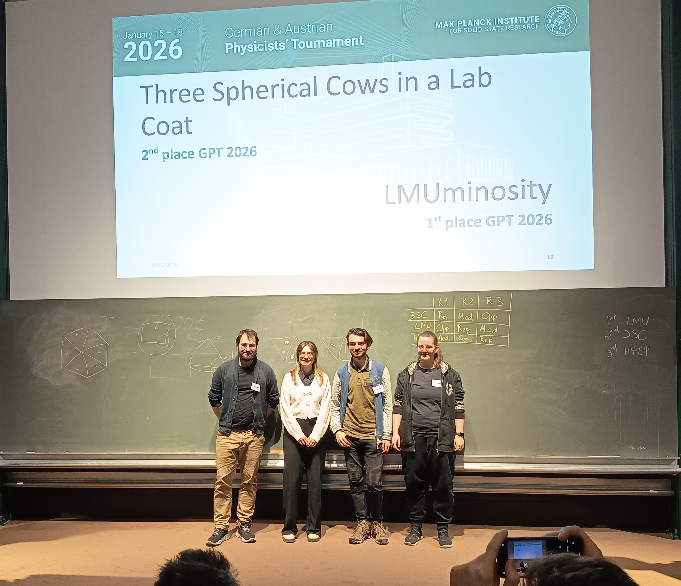 The GPT 2026 took place from January 15th to January 18th at the Max-Planck-Institute for Solid State Research in Stuttgart. It was the largest and longest GPT of all times: Almost 50 participants in a record number of 9 teams presented and discussed their solutions. The teams came from Aachen, Berlin, Erlangen, Hamburg, Munich, Münster, and Potsdam. Furthermore, one of the teams was the national team of Austria such making it a combined Austrian and German Physicists‘ Tournament.